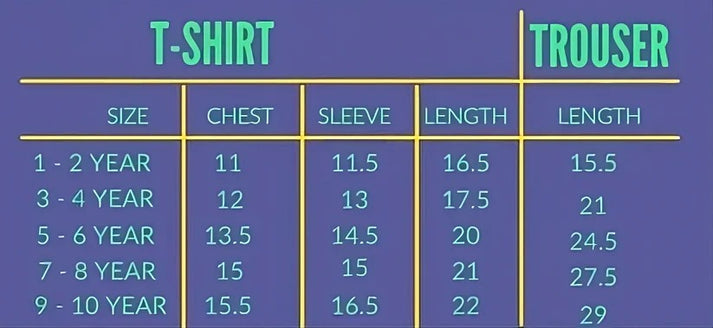 5-6 Years: Chest 13” | Length 20” | Trouser 22”