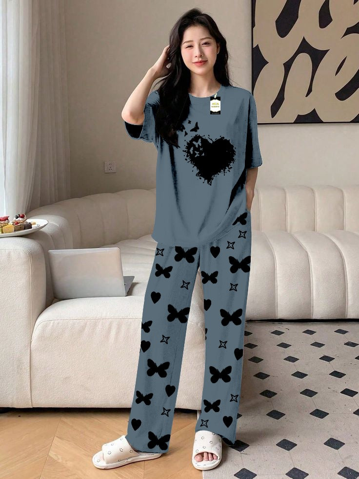 Aqua Blue Flying Heart Printed Nightwear Set With Star Butterfly Printed Trousers – Women's Lounge Wear (010)
