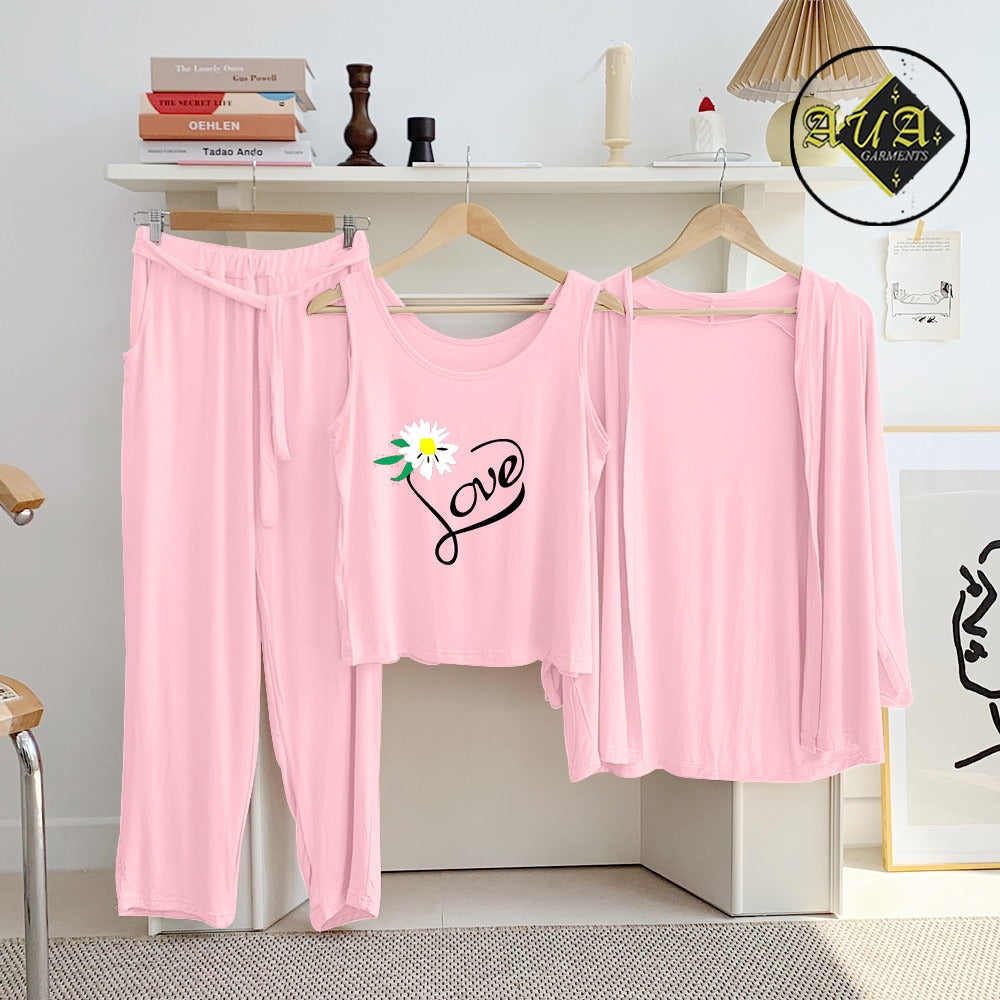 Baby Pink Trendy Love 3 Piece Lounge wear Nightwear Sleepwear For Women