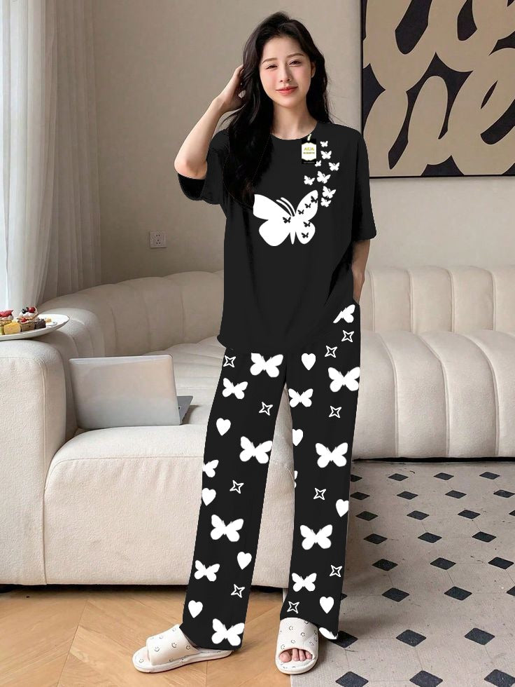 Black Flying Heart Printed Nightwear Set With Star Butterfly Printed Trousers – Women's Lounge Wear (010)
