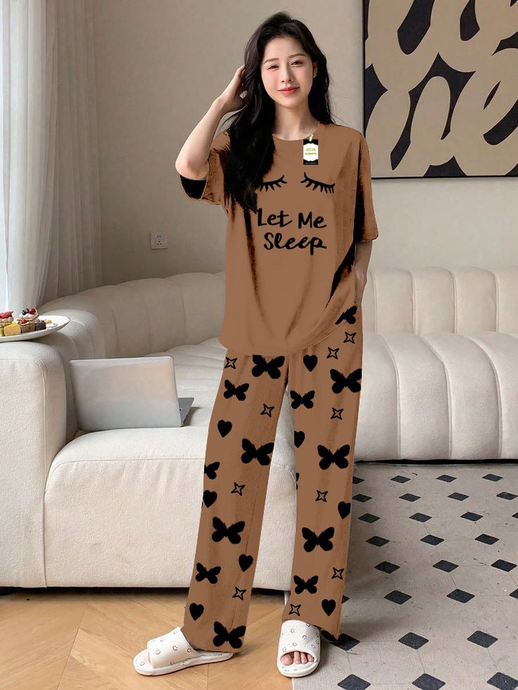 Brown Let Me Sleep Printed Nightwear Set With Star Butterfly Printed Trousers – Women's Lounge Wear (010)