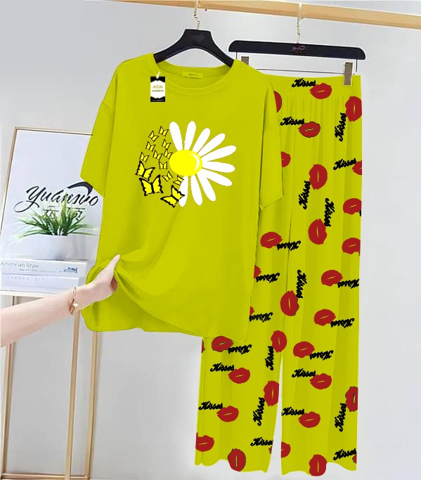 Green SunFlower Printed Nightwear Set With Kiss Printed Trousers – Women's Lounge Wear (014)
