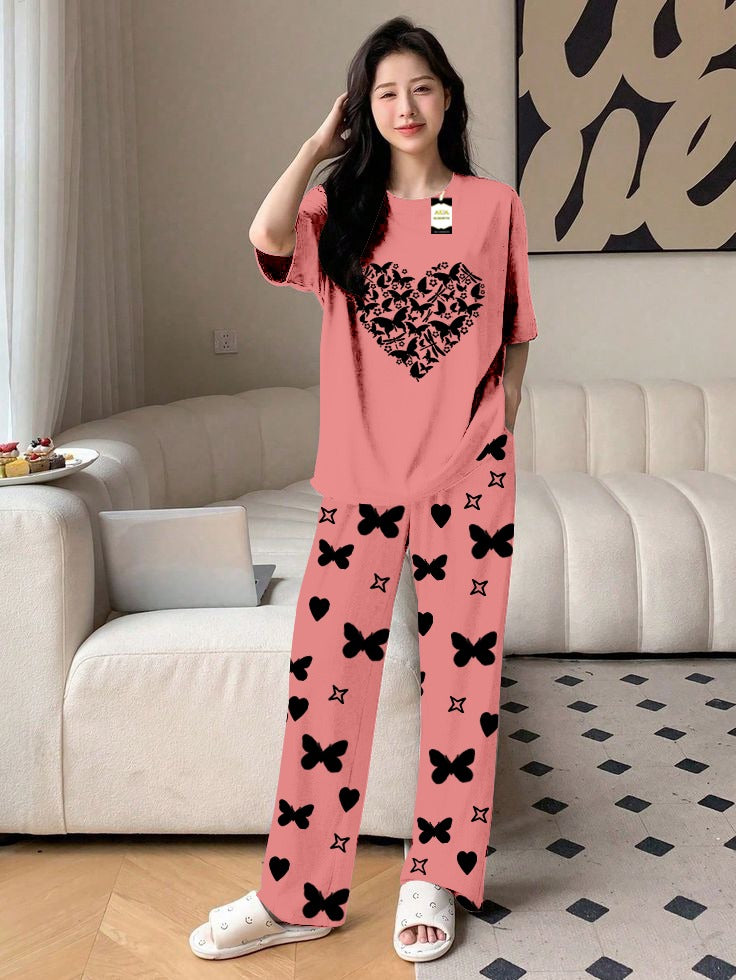Peach Butterfly Heart Printed Nightwear Set With Star Butterfly Printed Trousers – Women's Lounge Wear (010)