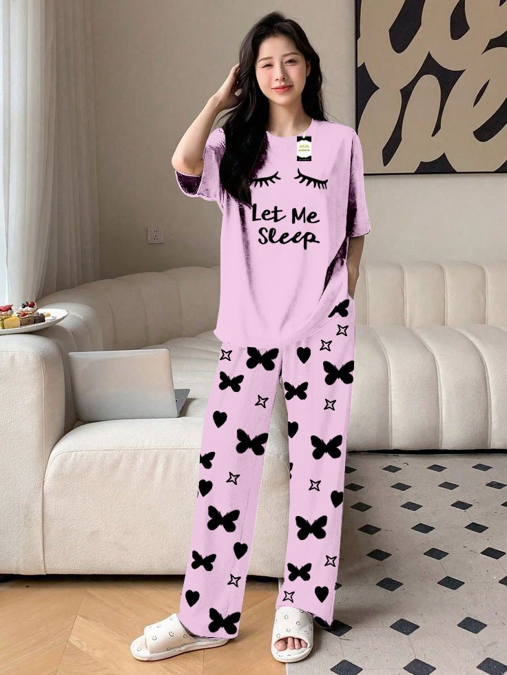 Purple Let Me Sleep Printed Nightwear Set With Star Butterfly Printed Trousers – Women's Lounge Wear (010)